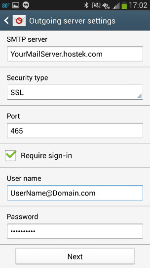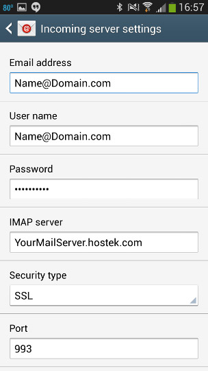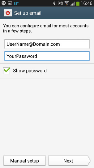 7. By default Android will not include your domain to the Username field. You will have to add this.